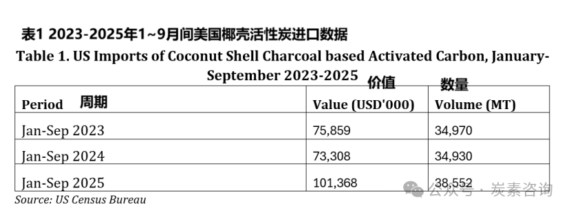 在此全球背景下,美国椰壳活性炭进口量在经历了2023-2024年相对平缓的表现后,于2025年1月至9月显著反弹。进口额从2023年的7590万美元小幅下降至2024年的7330万美元,而进口量则大体稳定在约35,000公吨,意味着价格有所疲软。相比之下,2025年出现急剧复苏,进口额升至1.014亿美元,同比增长38%,进口量扩大至38,552公吨,增长10%。价值增长远快于数量增长,表明单位进口价格显著上升。这反映了水处理、空气净化和工业应用领域更强劲的需求,加上主要供应国供应条件趋紧以及生产和物流成本上升。