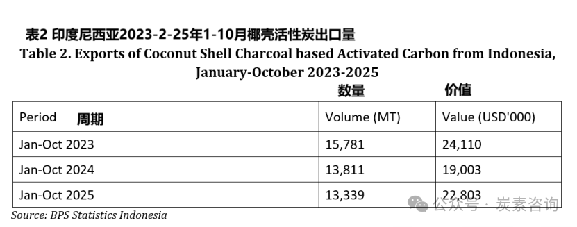 印度尼西亚的出口表现进一步证实了2025年高价格、供应受限市场的出现。在2025年1月至10月期间,椰壳活性炭出口量下降至13,339公吨,低于2023年的15,781公吨,也略低于2024年水平。这种持续收缩反映了原材料供应持续紧张以及产能扩张有限。尽管数量下降,但2025年出口收益急剧上升至2280万美元,从2024年的1900万美元恢复,并接近2023年水平(当时出货量显著更高)。这种反差表明2025年单位出口价格大幅上涨,是由飙升的椰壳炭成本和强劲的全球需求所驱动。与2023年(出口表现主要由数量驱动)或2024年(数量和价格均走弱)不同,印度尼西亚2025年的出口显然是价格主导的增长所支撑。