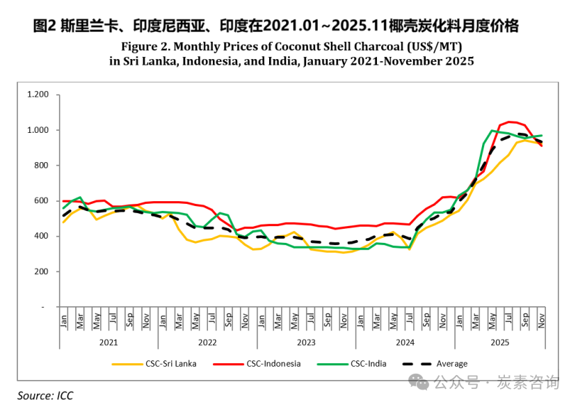 这些发展背后的根本原因是,2025年椰壳炭市场经历了一个决定性的转变,从2023-2024年相对温和的价格环境,转变为斯里兰卡、印度尼西亚和印度三国普遍异常紧张和高价的局面。虽然2023年和2024年上半年的价格基本稳定并在一定区间内波动,但2025年从年初开始就出现了快速且持续的上涨。2025年1月至6月间,这三个国家的价格都急剧上涨:斯里兰卡从约每公吨544美元涨至超过815美元;印度尼西亚从约每公吨616美元涨至超过1000美元;印度从约每公吨629美元涨至近990美元。与早些年价格变动平缓且常具季节性相比,这些上涨的速度和幅度都是前所未有的。尽管2025年最后一个季度价格略有回落,但仍保持在历史高位,这表明市场基本面发生了结构性转变,驱动因素是活性炭行业的强劲需求和受约束的原材料供应。