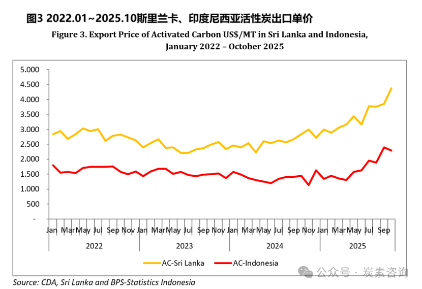 椰壳炭价格的飙升通过强劲的成本传导机制直接传导至活性炭市场。在2023年和2024年的大部分时间里,活性炭价格保持相对稳定,反映了炭价格的疲软。这一情况在2025年显著改变,因为炭价格在主要生产国飙升至前所未有的水平。不断上涨的炭成本显著增加了活性炭制造商的生产费用,特别是在印度尼西亚和印度,年中价格超过了每公吨900-1000美元。因此,活性炭价格急剧上涨:在斯里兰卡,从2025年1月约每公吨3000美元涨至10月超过4300美元;在印度尼西亚,同期从约每公吨1300-1400美元涨至超过2200美元。与2023-2024年观察到的有限波动相比,2025年的经历凸显了原材料与成品市场之间更紧密的联系。总体而言,2025年的趋势证实,高企且波动的椰壳炭价格已成为当前活性炭市场高价环境的主要驱动因素。